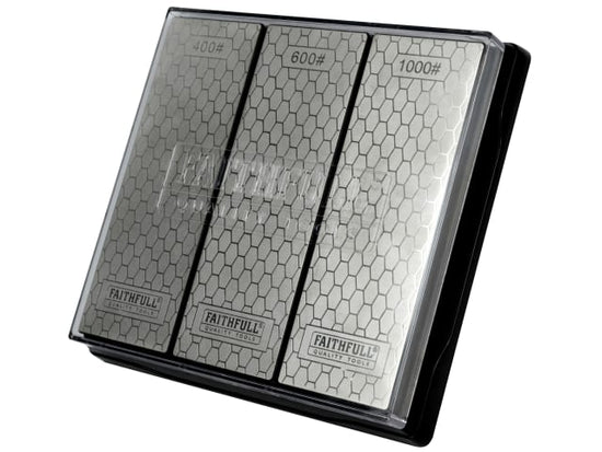 The Faithfull Diamond Whetstone Kit contains 3 stones for quick, easy and effortless sharpening of any blade. The 70 x 200mm metal stones are electroplated with monocrystalline diamond in three grits, 400G Coarse, 600G Medium and 1000G Fine. The ABS plastic base has non-slip pads for use on most surfaces, and each stone can be removed to be used separately.
