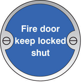 Fire door keep locked shut 76mm dia stainless steel sign