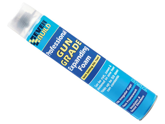 This Everbuild EVBEVGF7 gun grade expanding foam is a quick setting polyurethane based foam which expands greatly on application and yields up to 50 times the original can contents. It can be cut, sawn, plastered and sealed over after approximately one hour and is ideal for all building applications, will fill irregular gaps, fixes framework, insulates and deadens sound.