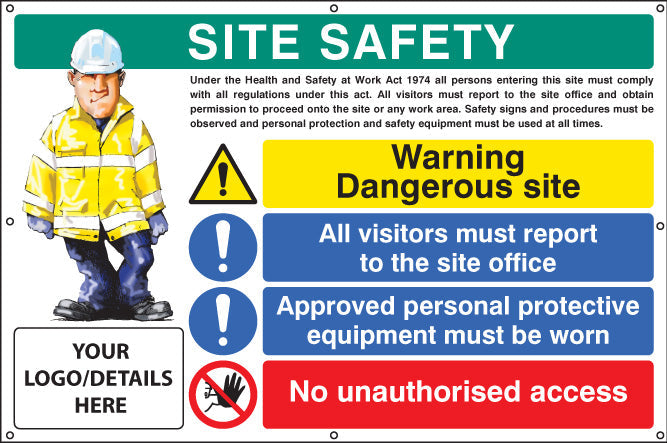 Site safety, dangerous site, visitors, PPE, access, custom banner c/w eyelets 1270x810mm