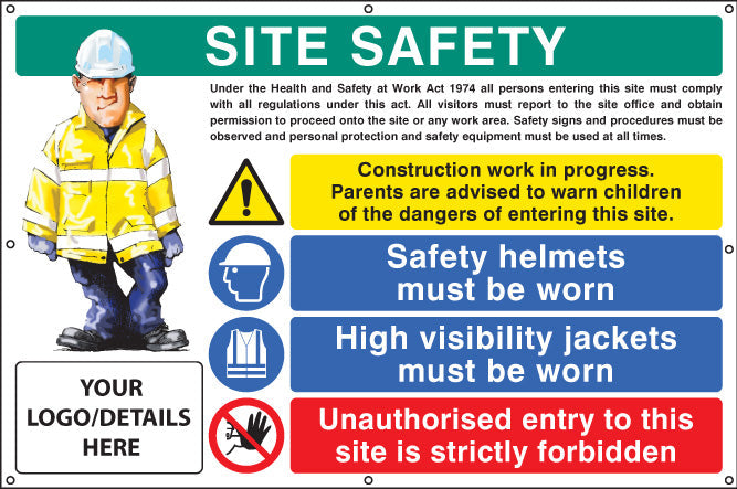 Site safety, helmets, hi-vis, unauthorised entry custom banner c/w eyelets 1270x810mm